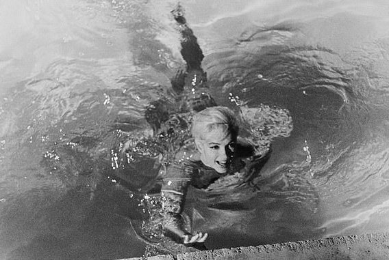 Монро начали снимать в купальном костюме обнаженного цвета, но каждый раз между дублями она направлялась к краю бассейна и все больше обнажалась. Во второй раз она вынырнула без лифа, а в третий — сбросила с себя плавки. В таком виде Мэрилин подплыла к краю бассейна и перекинула ногу через бортик.