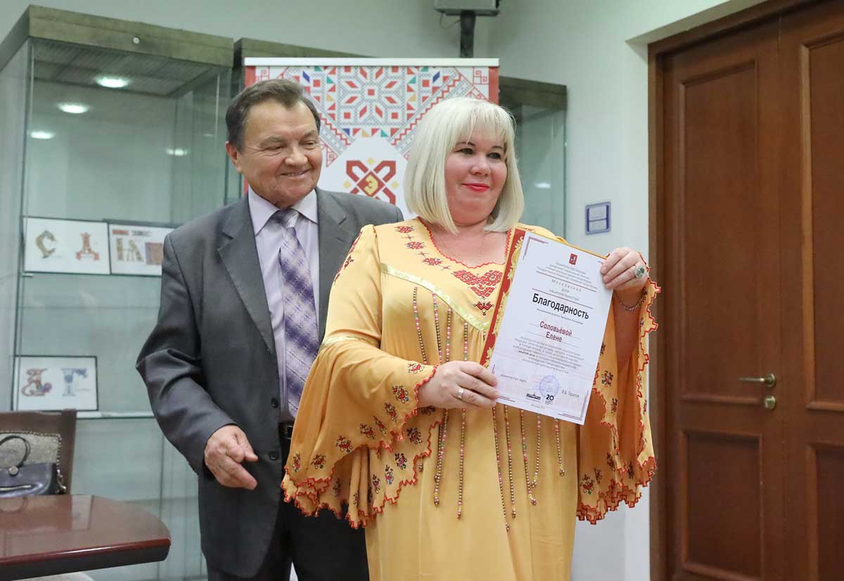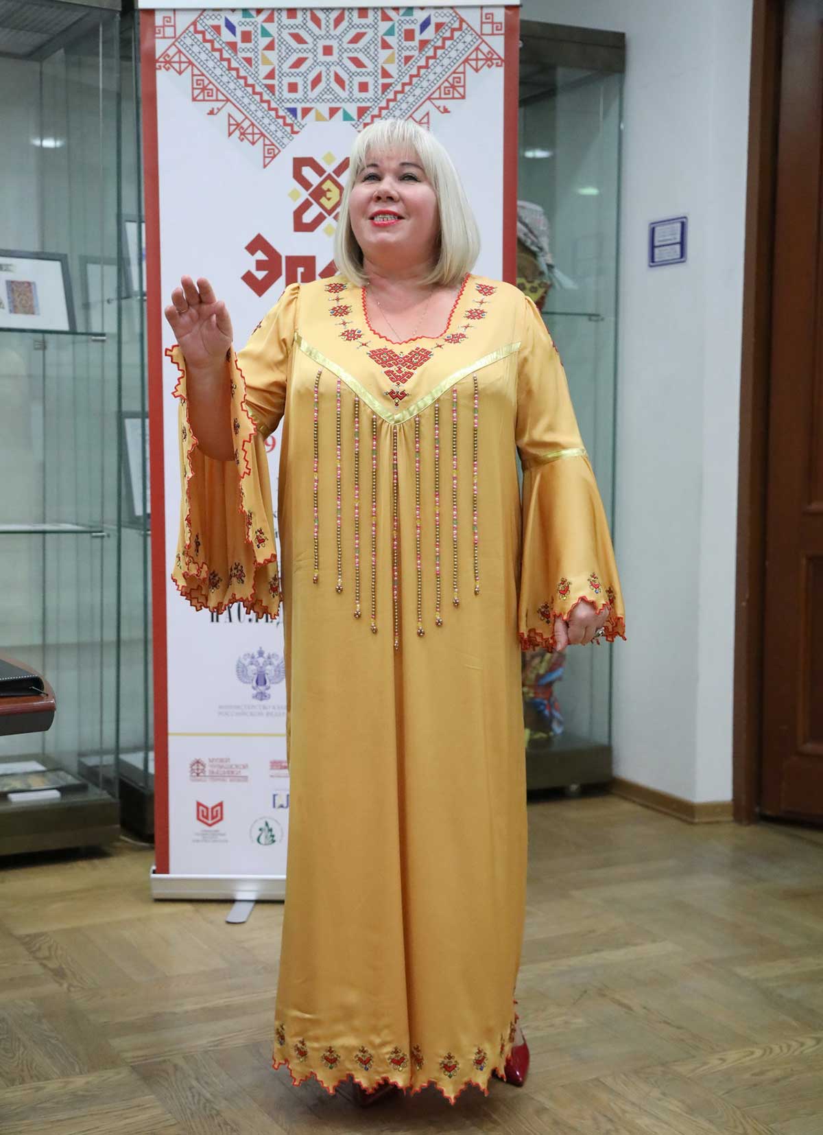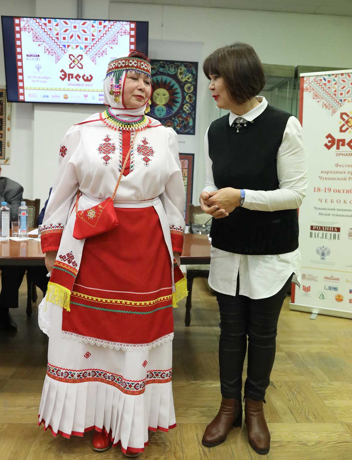 Также о сбережении культурного наследия и развитии творчества говорила руководитель Общества чувашской культуры Лира Смирнова. Она раскрыла некоторые секреты чувашских вышивальщиц (значение цветов и главных символов орнаментов). А потом Лира Петровна ответила на вопросы заинтересованной публики, объяснила, чем узоры на наряде чувашской девушки отличаются от орнаментов на одежде замужней женщины.