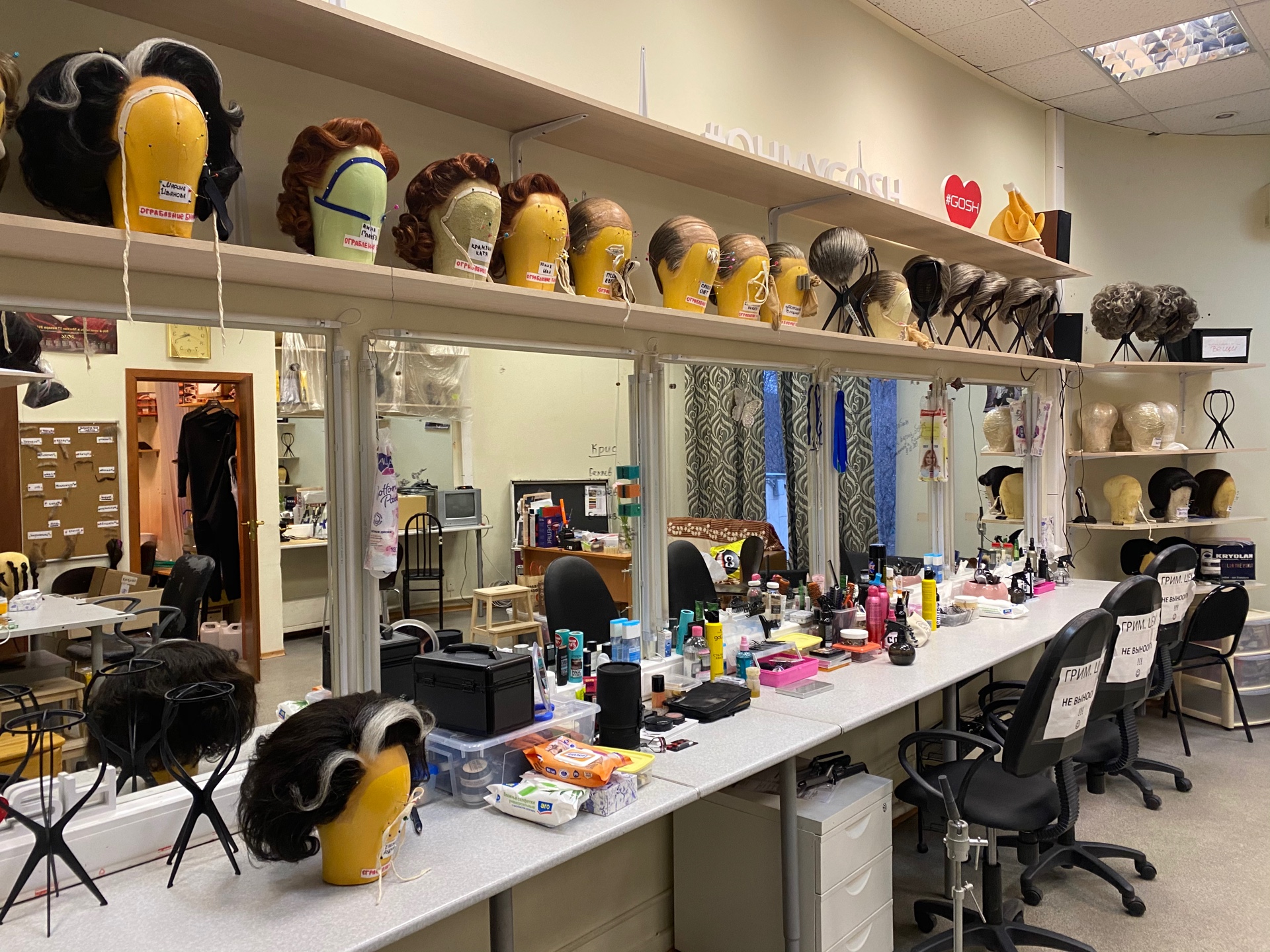 В соседней с костюмами комнате — гримерная. Дольше всех здесь задерживается исполнитель роли Уоррена Слакса. Его превращение в престарелого банковского стажера — от макияжа до надевания парика — занимает порядка 30 минут. Кстати, о париках — все они сделаны вручную из натуральных волос. Знаете, сколько времени уходит на создание одного «головного убора»? 10 часов или 30 дней? Рассказывать не станем — ответ ждет вас на на экскурсии по закулисью шоу «Комедия о том, КАК БАНК ГРАБИЛИ».