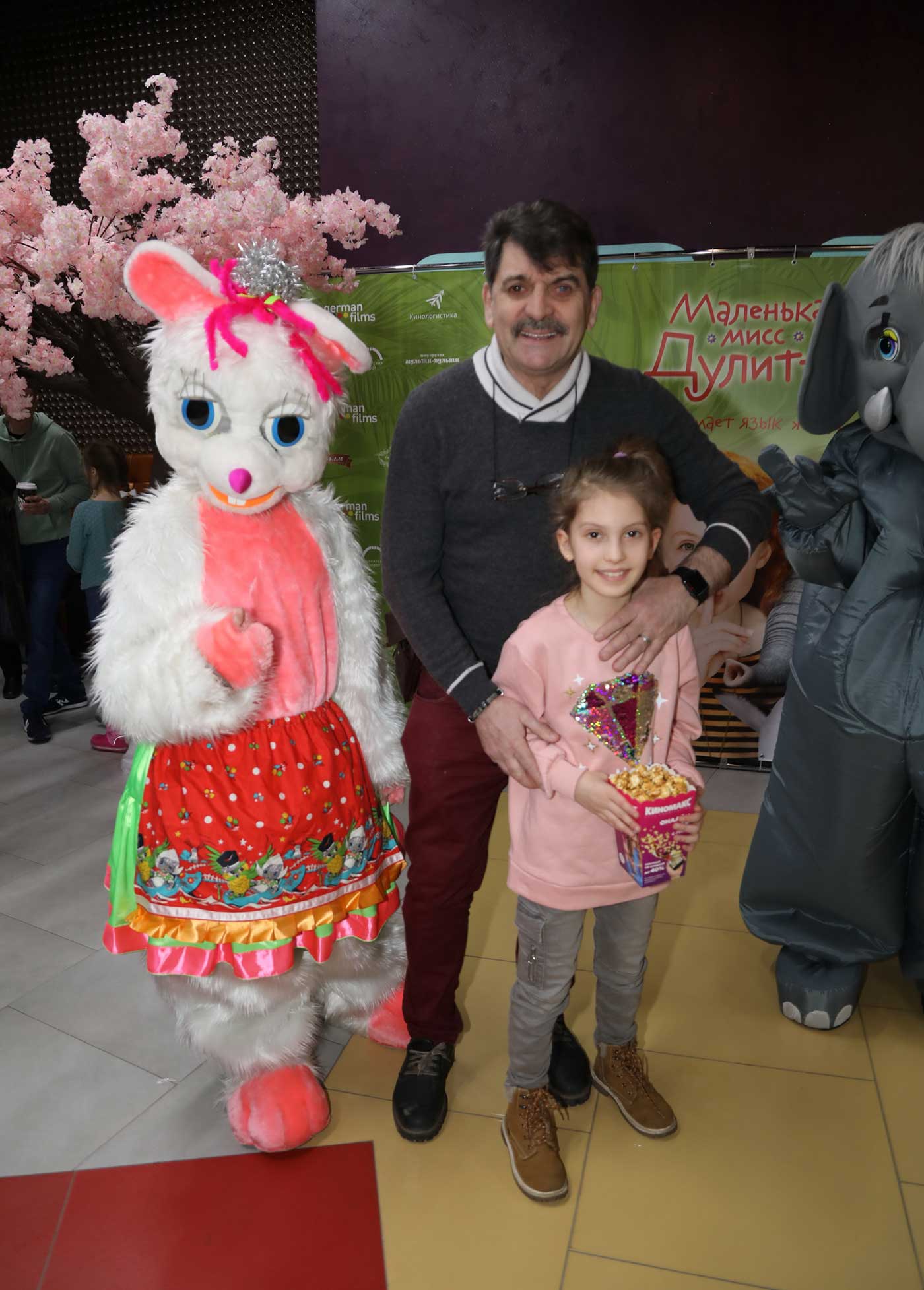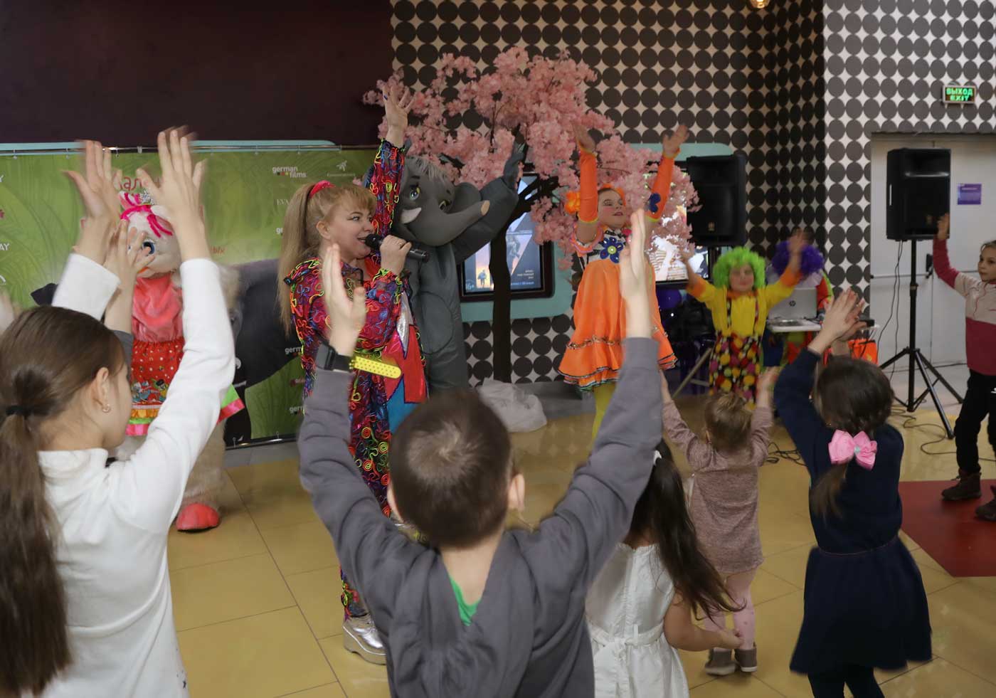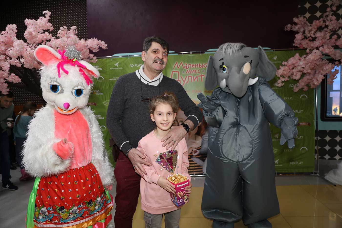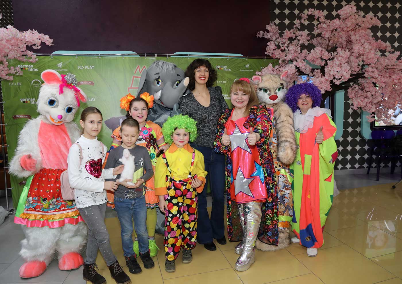 Перед началом просмотра в фойе гостей ожидала веселая развлекательная программа от шоу-группы «Мульти-пульти». А солистка группы «Витаминка» Наталья Тенькова подарила всем присутствующим радостное настроение песнями и танцами.Были и ростовые куклы в костюмах животных, кстати, а также и настоящие дрессированные зверьки - кролик, шиншилла и мини-пиг!