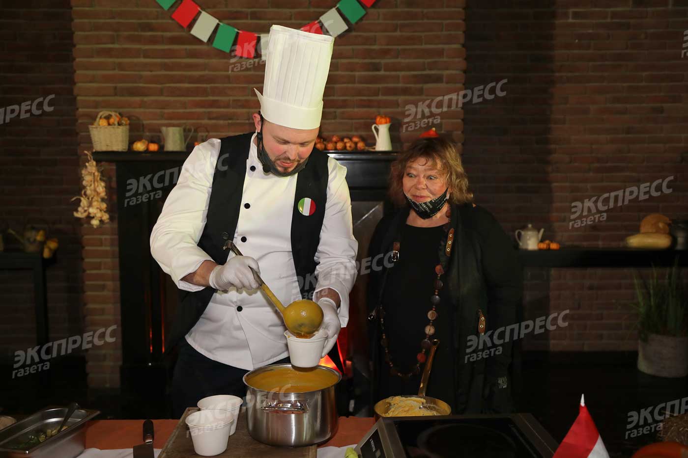 Все в этот вечер было пронизано духом солнечной Италии и, конечно, веселого, озорного мальчишки Чиполлино. Был собран необычный букет из овощей и цветов, созданный по мотивам "Приключений Чиполлино". Был даже гастрономический сюрприз — все гости смогли попробовать ароматный тыквенный супом с печеным цукини, луком шалот и сыром страчателло.