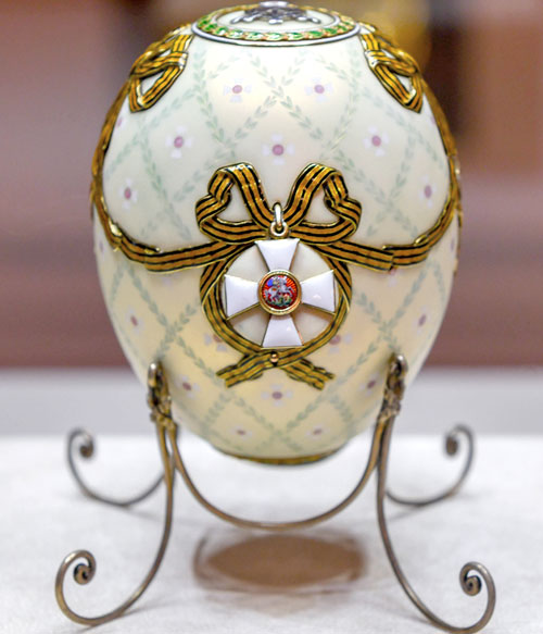 5. «Орден Святого Георгия» (1916 г.). Если сжать бока, георгиевские кресты откинутся, под ними увидим портреты Николая II и цесаревича Алексея, написанные акварелью по слоновой кости. Большевики распустили легенду, что императрица Мария Федоровна спрятала яйцо в интимном месте и вывезла из России.