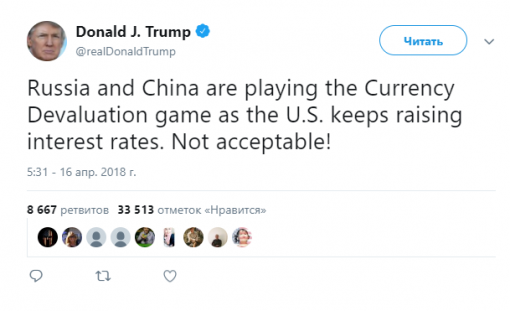 «Россия и Китай играют в игру валютной девальвации, в то время как США продолжают повышать процентные ставки. Это недопустимо»,— говорится в твите.