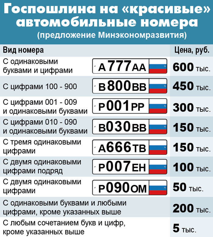 Минэкономразвития внесло предложение продавать так называемые «красивые» номера желающим выделиться из общего потока автомобилей. Цель — убить двух зайцев: пополнить бюджет и легализовать рынок. Вопрос обсуждается в МЭР и МВД.