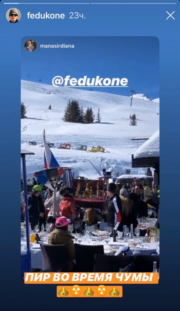 Между тем нашлись в тусовке и адекватные люди, решившие не рисковать своим здоровьем. К примеру, семья ресторатора Аркадия Новикова решила не ехать на горнолыжный курорт из-за коронавируса, о чем дочь бизнесмена Александра сообщила подписчикам. Осудил веселящихся в Куршевеле и рэпер Фэдук, назвав их отдых «пиром во время чумы».