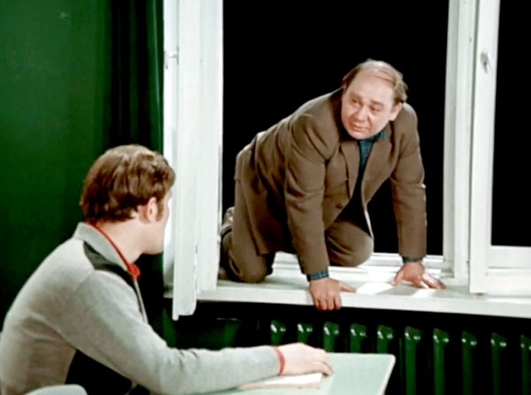 Евгений Павлович много привнес в свою роль. Например, озорная сцена с залезанием в окно и шлепок по попе взрослой дочке прямо в классе - его придумки.