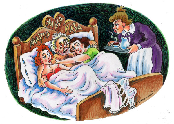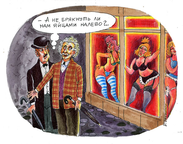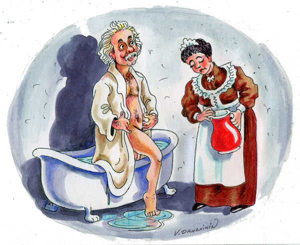 Эйнштейн слыл ловеласом и, как утверждают биографы, чем «грязнее и примитивнее» были женщины, чем больше от них пахло потом, тем больше они ему нравились. Однажды уже пожилой физик чрезвычайно возбудился, увидев молоденькую особу, месившую тесто. Не прочь был прошвырнуться и по проституткам. Посетив публичный дом, мог рубануть без политесов: «Я брякнул яйцами налево». Однажды читал лекцию в Цюрихе, на которую забрела красивая путана в боевом раскрасе. Так мэтр чуть не свалился с кафедры, желая к ней познакомиться. Именитый затейник обожал кошмарить прислугу, выходя из ванной в распахнутом халате. Загорал во дворе своего дома без трусов. А увидев проходящую мимо даму, вскакивал нагишом и принимался здороваться.