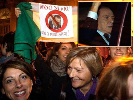 А в это время на улицах Италии собрались тысячи граждан, которые радостными хлопками проводили премьер-министра, чье правление загнало страну в миллиардные долги.
