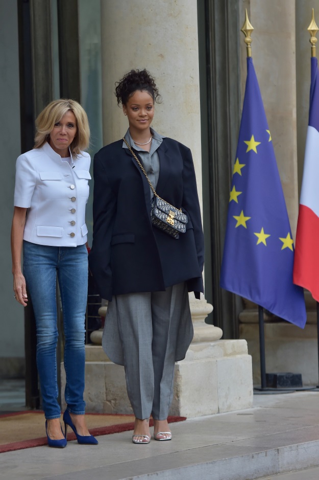 На встречу с певицей Рианной Бриджит выбрала весьма молодежный образ: белую футболку-поло и узкие джинсы, которые подчеркивали стройную фигуру первой леди.