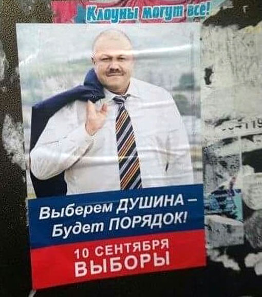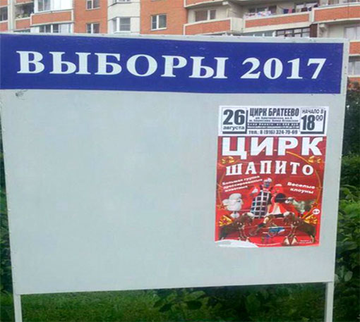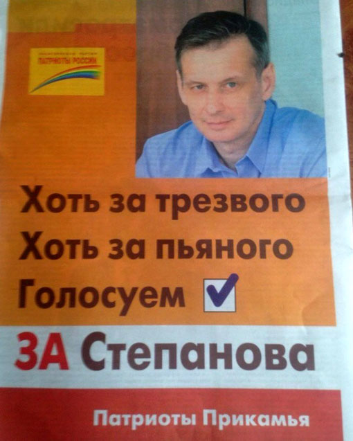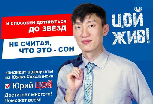 В Прикамье избирателям предлагают голосовать за кандидата Степанова в каком бы состоянии он не находился - «хоть за пьяного, хоть за трезвого». Город Устюжна благодаря работе местных креативщиков, потрудившихся над плакатом Николая Козлова, стал родиной козлов. В Южно-Сахалинске кандидат однофамилец известного певца Виктора Цоя цитирует на своем агитплакате цитату из песни «Звезда по имени солнце». Избирателей уверяют, что «Цой жив!».