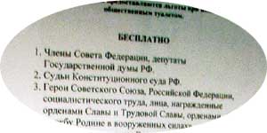 Депутаты - тоже люди и, судя по табличке, висящей у входа в платный туалет столичного Белорусского вокзала (см. фото), им также хочется "пи-пи". И не только им. Удивительно, но, видимо, члены Совета Федерации и даже конституционные судьи здесь частые посетители. Нетрудно представить, как они, пробегая мимо кассы, одной рукой показывают служебное удостоверение, а другой манипулируют с ширинкой.