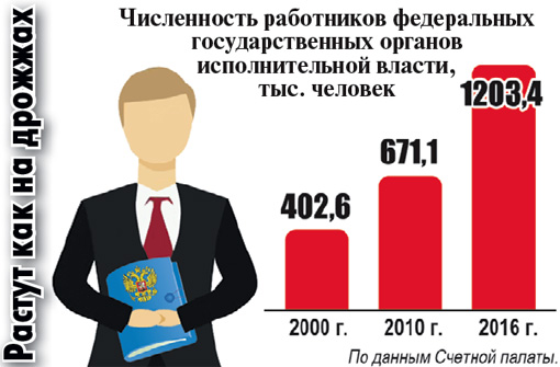 Оказалось, что чиновников за годы кризиса заметно прибавилось. Например, в 2004 году министерств насчитывалось девять, а сейчас - 16. С 2012 года число подведомственных учреждений выросло на 24,8 процента, а число филиалов - вдвое. Также резко прибавилось различных руководящих должностей: на 18,2 процента увеличилось число заместителей глав федеральных государственных органов исполнительной власти, на 21 процент - директоров департаментов, на 13 процентов - глав управлений и на 19,2 процента - начальников отделов.