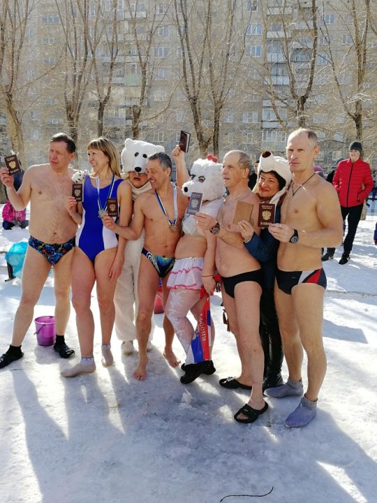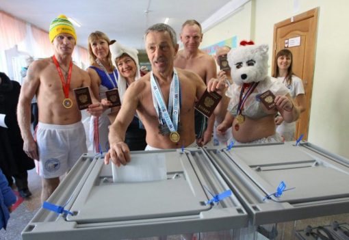 Нестандартную акцию устроили в Барнауле представители федерации закаливания и зимнего плавания Алтайского края. Участники организации, носящей также название «Белые медведи», пришли на избирательные участки в тех же самых костюмах, в которых участвуют в зимних заплывах.