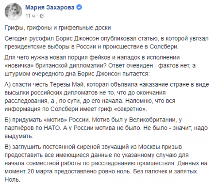«Много месяцев — именно так, дословно. Так на основе чего Тереза Мэй сделала вывод о причастности России, если следствие, по словам ее же полиции, будет длиться месяцы? А вот и мнение Организации по запрещению химического оружия сегодня обнародовано: на анализ вещества (только на анализ) уйдет не менее трех недель. Странно, у британского правительства на это ушло, судя по первой реакции, пара часов", — отметила представитель МИД.