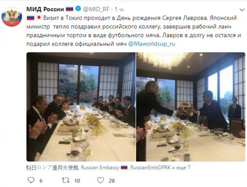 «Визит в Токио проходит в День рождения Сергея Лаврова. Японский министр тепло поздравил российского коллегу, завершив рабочий ланч праздничным тортом в виде футбольного мяча. Лавров в долгу не остался и подарил коллеге официальный мяч», говорится в