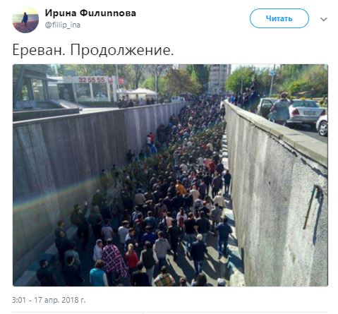 В столице Армении Ереване лидер партии «Гражданский договор» Никол Пашинян объявил о начале «бархатной революции». Таким образом политик выразил свой протест против избрания новым премьер-министром страны бывшего президента Сержа Саргсяна.
