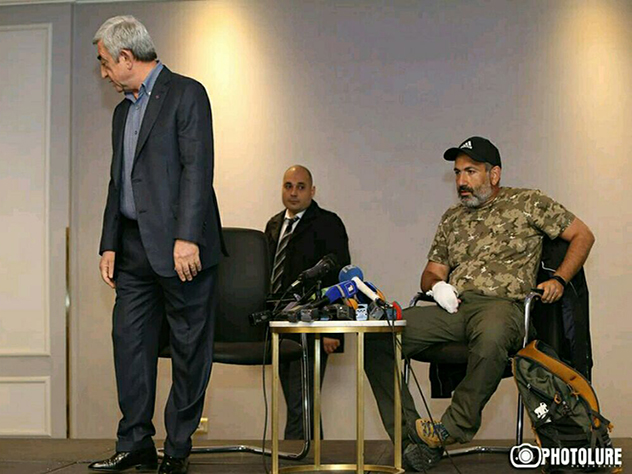 Перед переговорами Никола Пашинян заявил, что темой встречи «может быть лишь отставка премьера и мирный плавный переход власти». Его слова транслировались в прямом эфире армянской редакции американской радиостанции «Свобода».
