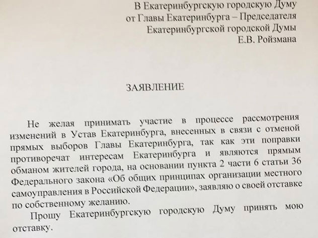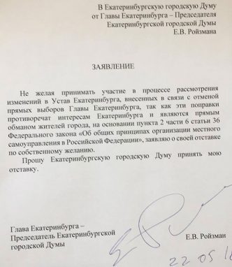 Причиной отставки Ройзман назвал отмену прямых выборов мэра Екатеринбурга. На сегодняшнем заседании дума должна одобрить соответствующие изменения в городской устав.