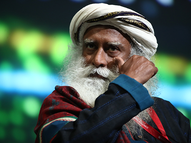 Приехавший по приглашению главы Сбербанка Германа Грефа на Международный экономический форум в Санкт-Петербург индийский философ-мистик и йогин Джагги Васудев, больше известный как Садхгуру, специально посещает такие статусные мероприятия, чтобы пообщаться с главами крупных компаний.