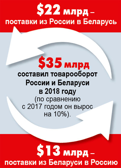 - Товарооборот России и Белоруссии в 2018 году составил $36 млрд. По сравнению с 2017 годом он вырос на 10%. При этом $22 млрд - это российские поставки, и только $13 млрд - экспорт соседей в РФ. Россия - главный торговый партнер Белоруссии. Ее доля в товарообороте - около 50%. Хотя Белоруссия занимает только 4-е место во внешнеторговом обороте РФ.