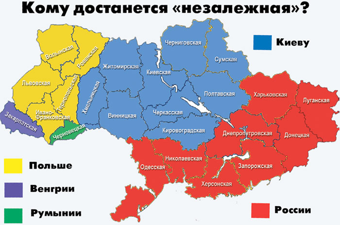 Для нас Украина важна чрезвычайно, и нам надо обеспечивать там свое присутствие хотя бы в информационном плане, поскольку страна идет к распаду и неизвестно, сколько ей осталось. Посмотрите на ее соседей, которые в спешном порядке раздают украинцам свои паспорта. Это и поляки, и венгры, и румыны. Они примеряются к будущему разделу и столбят территорию на случай кризиса, когда Украина окажется без сбежавшего в Лондон руководства.