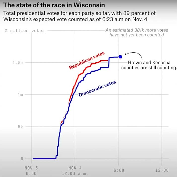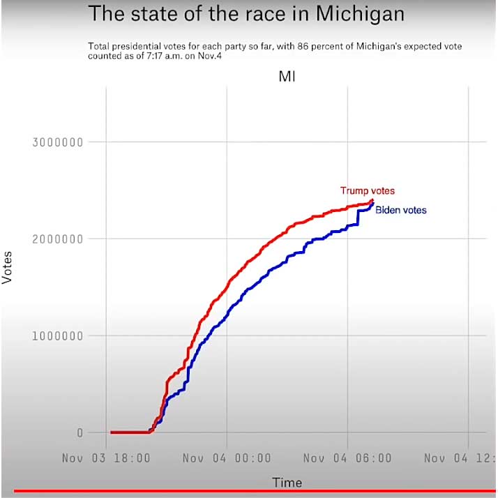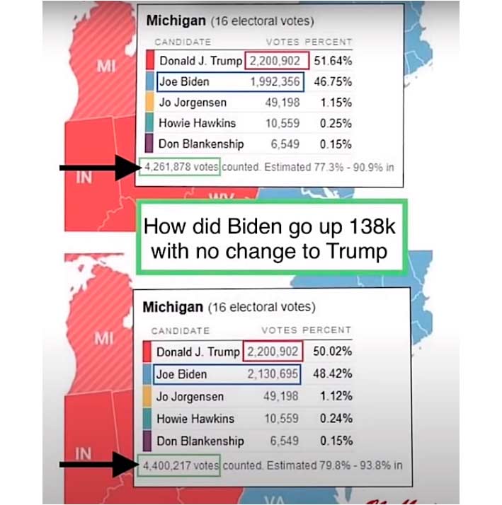 В ролике на он продемонстрировал табличку, согласно которой явка избирателей в Аризоне составила 101%, в Мичигане и Висконсине – 105%, в Северной Каролине – 106%, в Миннесоте – 107%, в Пенсильвании – 109%, а в Неваде и подавно – 125%.
