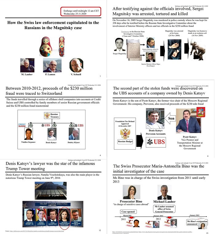 Дело в том, что в течение последних нескольких дней в некоторые редакции, как в иностранные, так и в российские (точнее, оппозиционные — «Новая газета», «Медуза», «Эхо Москвы» и т. д.; полный список имеется) поступила удивительная методичка на 60 (шестидесяти!!!) страницах с иллюстрациями и схемами, обязательными для публикации. Название документа простое: «Как швейцарские правоохранительные органы капитулировали перед русскими в деле Магнитского», и в нем подробно и наглядно разъясняется то, что «все неправда», а на самом деле «Магнитского убили в СИЗО за то, что он раскрыл схему отмывания миллиардов», а потом «спрятали украденные деньги в Швейцарии». Основной смысл указанной методички заключается в том, что «плохие русские», оказывается, «коррумпировали швейцарское правосудие», и теперь ему, швейцарскому правосудию, нельзя верить ни в коем случае, а можно верить только международному мошеннику Браудеру и преданным адептам «дела Магнитского». Истерика? Однозначно.