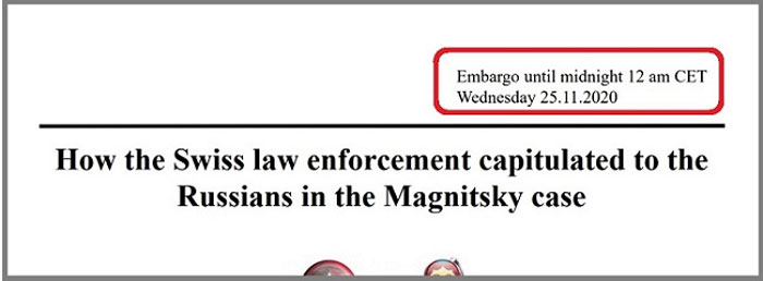 Да, и еще имеет смысл обратить внимание на фразу, указанную на титульном листе и других страницах: «Embargo until midnight 12 am CET. Wednesday 25.11.2020». Что это значит? А значит это то, что заказные публикации по «методичке Браудера» в российских и иностранных СМИ и блогосфере начнут появляться только с полуночи на среду, 25 ноября 2020 года. Ждем-с.