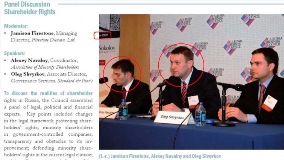 Помимо деловых взаимоотношений на почве схем с «миноритарными акционерами» Навальный и Файерстоун совместно участвовали и в публичных мероприятиях на эту же тему. Так, в Вашингтоне в марте 2009 года (до смерти Магнитского оставалось чуть больше полугода) Алексей Навальный участвует в конференции «USRBC 2009», а модератором панели оказывается тот самый «начальник Магнитского» и «подчиненный Браудера» Джеймисон Фаерстоун.
