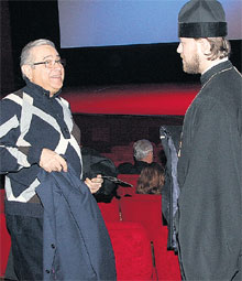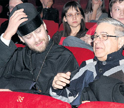 Ольга ЕМЕЛЬЯНОВА, фото автораПока звезда сериала «Саша и Маша» Елена Бирюкова делилась с коллегами мечтами о роли военнослужащей, а Леонид Якубович рассуждал о современном кинематографе, в зрительный зал прошествовала любопытная парочка: Евгений Петросян и православный священник. Мужчины подошли к своим местам, указанным на билетах, и, обнаружив, что они заняты незнакомыми дамами, вежливо попросили освободить им кресла. Женщины с извинениями удалились. Евгений Ваганович и его спутник, устроившись поудобнее, продолжили беседу.
