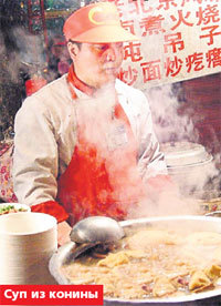 Здесь все шкворчит, шипит, шибает в нос безумным амбре. На веревочках болтаются, свесив хвостики, ободранные тушки неведомых зверушек. В котлах булькает ведьмино варево, с жаровен таращатся чьи-то голубые глазки. Перед вами Мекка столичной китайской кухни - улица Вангфуджинг. Именно сюда, поблизости от главной площади Пекина - Тяньаньмэнь, направляются оголодавшие гости Олимпиады - эта достопримечательность включена в официальный туристический маршрут. В поисках утки по-пекински (с недавних пор это блюдо запретили готовить в Европе из-за вредных выбросов продуктов горения в атмосферу) забрела на Вангфуджинг и я.