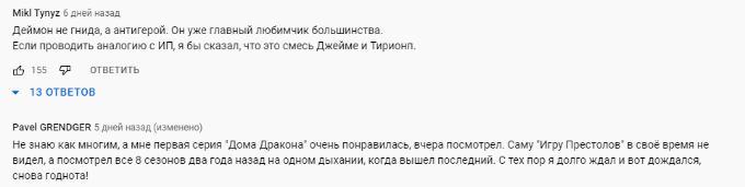 Одни пользователи Сети признались, что с первой же серии влюбились в проект про дом Таргариен. Другие отметили, что сериал с первых же минут погружает зрителей в тревожную атмосферу. В числе прочего людей поразили сцены насилия, секса и так далее. Впрочем, «Игра престолов» тоже не имела славы детской сказки на ночь. Наоборот, зрители потому и любили экранизацию книг Мартина — она была мрачной и жестокой. Так что ожидать от «Дома Дракона» чего-то иного было бы странно.