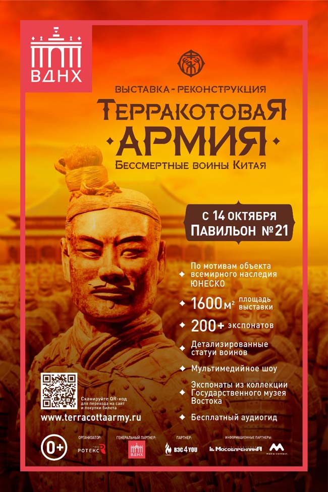 Впервые в России москвичам и гостям столицы будет представлена выставка-реконструкция, основанная на археологической сенсации XX века - глиняной армии китайского императора Цинь Шихуанди, правившего в III веке до нашей эры. Китайская Терракотовая армия является объектом Всемирного наследия ЮНЕСКО и по праву может считаться восьмым чудом света. В этих фигурах воплотились рационализм эпохи Цинь и своеобразная красота в благородном, торжественном безмолвии древних изваяний. С приветственной речью выступит почетный гость Марк Юрьевич Ульянов — российский историк-востоковед, заведующий кафедрой китайской филологии Института стран Азии и Африки МГУ им. М. В. Ломоносова, научный сотрудник Отдела Китая Института востоковедения РАН. В качестве почетных гостей ожидается посол Китайской Народной Республики в Российской Федерации г-н Чжан Ханьхуэй, Генеральный директор Государственного музея Востока А.В. Седов, Директор Института Стран Азии и Африки МГУ им М.В. Ломоносова А.А. Маслов, Генеральный директор АО «ВДНХ» С.Ю. Шогуров, начальник Главного контрольного управления города Москвы Е.А.Данчиков, Министр культуры Российской Федерации О.Б. Любимова, Министр науки и высшего образования Российской Федерации В.Н. Фалькова,