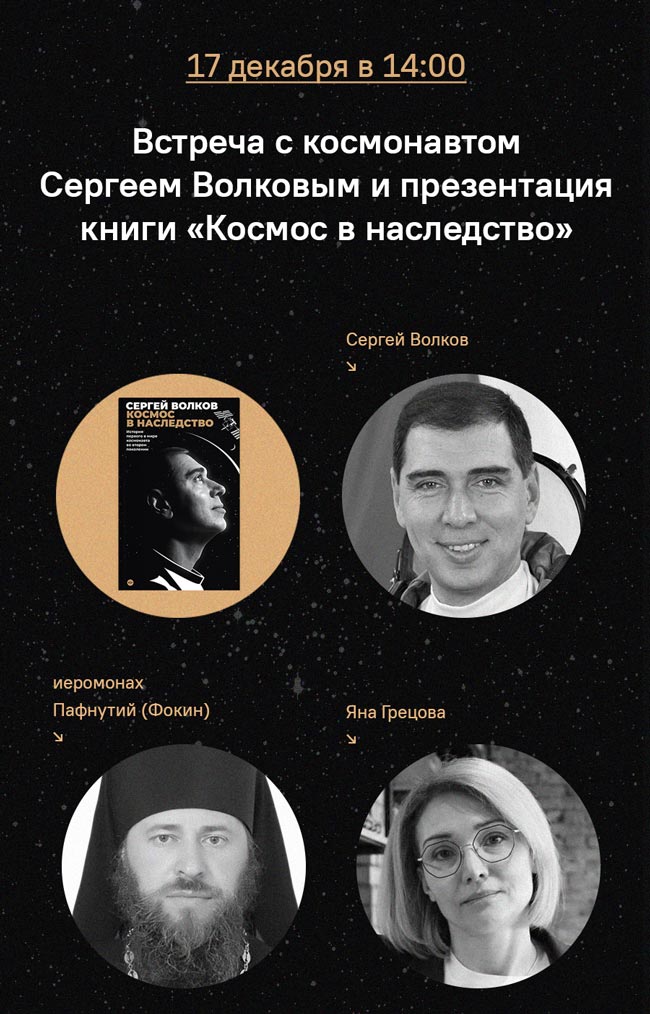 В субботу, 17 декабря, в 14:00 приглашаем всех на встречу с Сергеем Волковым, первым в мире космонавтом во втором поколении, автором книги «Космос в наследство». Его собеседниками станут Яна Грецова — руководитель редакции издательства «Никея», и Иеромонах Пафнутий (Фокин) — настоятель храма Преображения Господня в Звездном городке.