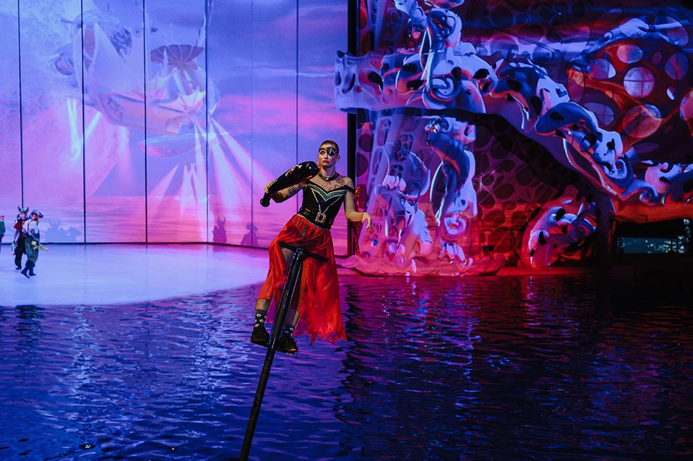 Красивейшие видеоинсталляции и трехмерные проекции на гигантской рельефной декорации площадью 770 квадратных метров создают полноценную иллюзию присутствия зрителей в центре событий. Представление сопровождается 5D-эффектами: ароматы океана, туман и морской бриз. Украшением мюзикла стали 32 танцующих фонтана, которые взлетают на высоту 9 метров.