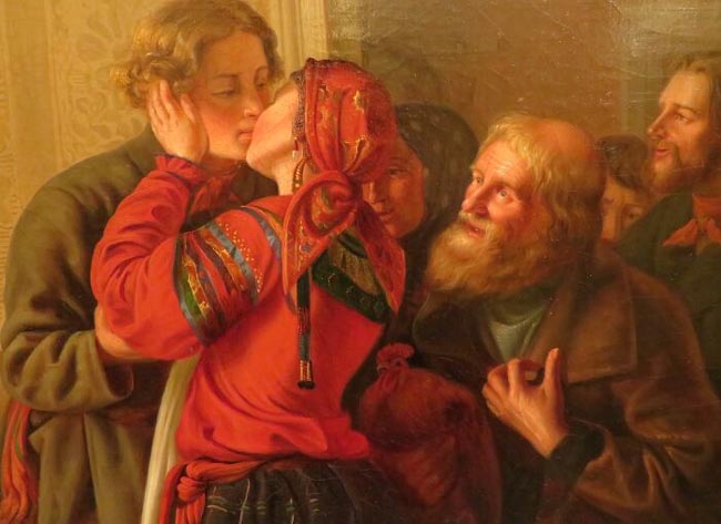 В старину поцелуями обменивались не только для выражения любви, но и для пожелания здоровья и продолжительной жизни. Этим объясняется корень “цел”, столь непонятный современному школьнику. На самом же деле он обозначал на Руси целостность и благополучие. Именно отсюда появилась традиция встречать гостей поцелуем. Правда, все не ограничивалось на традиционном тройном поцелуе в щеки. Обряды были намного более разнообразными. Например, при приветствии гостей и хозяев существовала традиция обменяться поклонами, после этого испить вина из одной чарки, а затем поцеловать в губы жену хозяина. С помощью этого люди выражали почитание и уважение. Вышестоящего по статусу человека следовало целовать в плечо, руку или даже в ногу. Он же отвечал поцелуем в голову или лоб. Интересно, что протянутая для поцелуя рука, например, монарха обозначала его расположенность. Такой чести удостаивались не все.