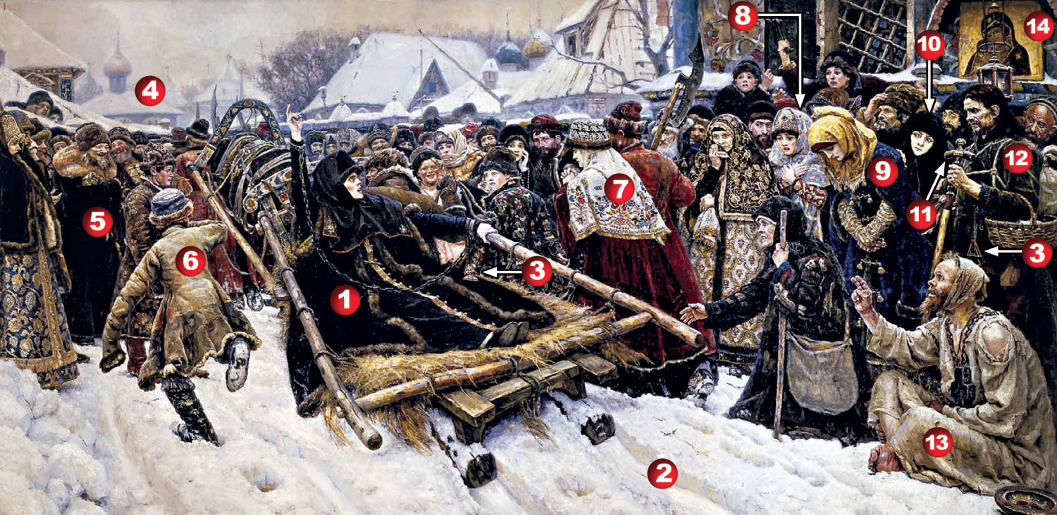 6. Куда бежит этот мальчишка, если впереди смыкается толпа и будто упираются друг в друга две стороны улицы, образуя тупик. Это путь боярыни в никуда, в небытие, и динамичная фигура пацана подчеркивает это.