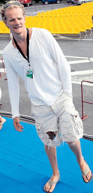 Стилист: По внешнему виду очевидно, что человек творческой профессии - очень свободный, небрежный стиль. Растянутая кофта и рваные шорты ему идут и ничуть не простят. Но гораздо интересней и брутальней смотрится рваная джинса. Также стоит заменить невзрачные вьетнамки на кожаные сандалии или лоферы (то же, что и мокасины, но с толстой подошвой и каблуком, без шнуровки).