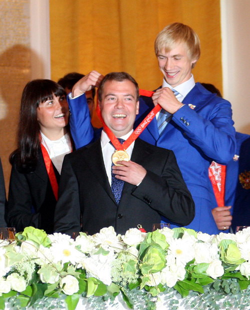 Дмитрий Анатольевич с удовольствием примерил пекинское «золото» Андрея СИЛЬНОВА. Фото Сергея ПАНКРАТЬЕВА/«Советский спорт» |