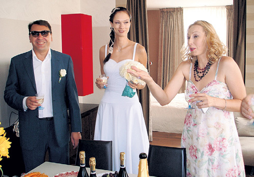 - Свадьба была по русским традициям – с выкупом невесты?- Мише пришлось нелегко. У Катюши квартира на Шаболовке на 18-ом этаже. Подружки придумали для жениха разные забавные препятствия. Представляете, сколько пота, сил и старания он приложил, чтобы добраться до квартиры любимой женщины!- На рост Гамовой 202 сантиметра, наверное, трудно было подобрать платье в свадебных салонах?- С платьем такая предыстория. У Кати было любимое белое платье на бретельках, но очень коротенькое. В загс, сами понимаете, в таком не пойдешь. Она решила, что к верху нужно обязательно придумать длинную юбку. Ее сшили на заказ. Получился великолепный наряд.- Молодожены отказали в свадебной съемке многим изданиям. Но на торжестве, судя по сделанным вами снимкам, присутствуют фотокамеры.- Это специально нанятые профессионалы. Фото-и видеозапись для семейной истории. У входа в загс на улице случился небольшой переполох. Невеста с женихом и гостями ждали приглашения на регистрацию, а буквально в ста метрах от нас кто-то устроили пикет в поддержку участниц группы «Pussy Riot», осужденных на два года колонии общего режима за хулиганство в храме Христа Спасителя. К пикетчикам сбежались журналисты. Заметив их, Катя занервничала. Спрятаться было некуда. Тогда она взяла у подруги розовую накидку и укрыла ей голову.