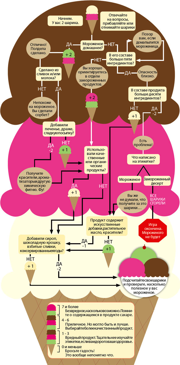 Поэтому многие переходят на домашнее мороженое. Рецептов в Интернете - сотни. Чтобы получить классический продукт, а не просто заморозить взбитые молоко со сгущенкой, используйте стандартный состав: сливки, молоко, яичные желтки, сахар. И мороженицу - выбор нынче велик, цена приемлемая (от 2 тыс. руб.). Придется немного повозиться, зато точно будете знать, что положили только полезные продукты (чтобы проверить, насколько здоровое у вас мороженое, сыграйте в нашу игру).