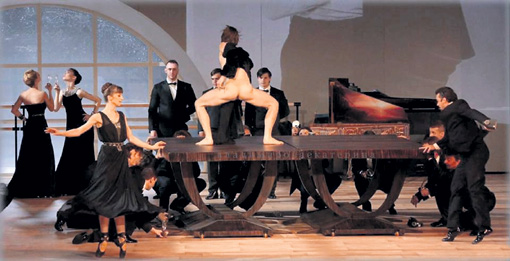 8 июля на закрытый показ пригласили горстку своих: Романа Абрамовича, Михаила Швыдкого, Вадима Верника, Сергея Филина, сотрудников театра, нескольких критиков. Видимо, понимая, что спектакль могут зарубить, зрителям дали снять происходящее на мобильники, после чего Сеть заполонили фото мужиков с голыми задницами и мешочками на членах. Мужчины разгуливали по сцене в юбках и на каблуках, сливались в страстных па, а задник сцены венчал знаменитый портрет обнаженного Рудольфа Нуреева с неприкрытым причинным местом. Говорят, право на использование этого снимка создатели спектакля выкупили за $300 тысяч. То, что сам артист был глубоко возмущен «голой» фотосессией, сделанной в 1961 году фотографом Ричардом Аведоном, и даже взял с него слово не публиковать ее, которое тот не сдержал, «почитателей» таланта Нуреева ничуть не смутило. «Рудик нами доволен, я уверен», - написал в «Фейсбуке**» Серебренников, отвесив кумиру такую вот оплеуху.
