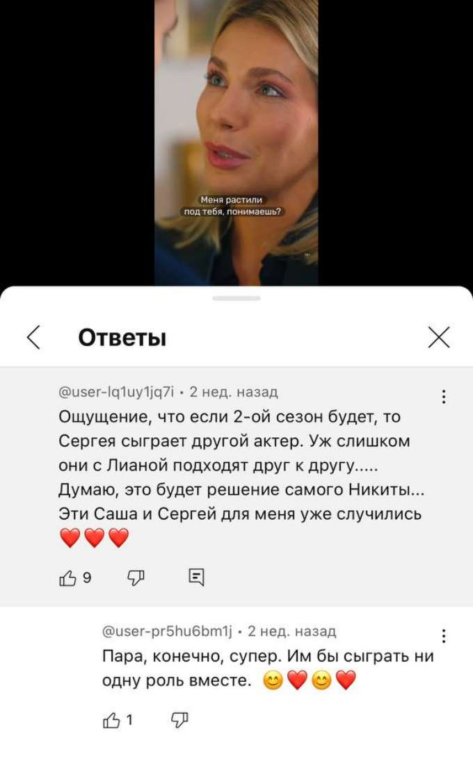 «Ощущение, что если второй сезон будет, то Сергея сыграет другой актер. Уж слишком они с Лианой подходят друг к другу… Думаю, это будет решение самого Никиты… Эти Саша и Сергей для меня уже случились».