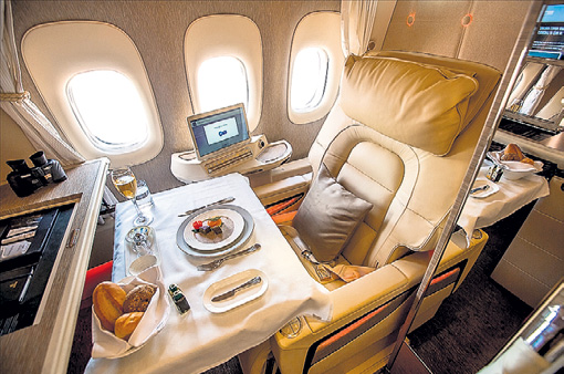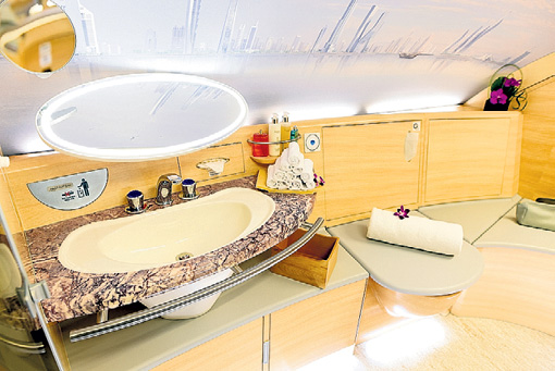 Самое примечательное в лайнере - шесть сьютов класса люкс площадью 3,7 квадратных метра каждый. Они похожи на купе и полностью закрыты от глаз посторонних. При желании кресло можно превратить в кровать, имеются шкафы для одежды. Каждому путешественнику выдают пижаму - она изготовлена по микрокапсульной технологии и может увлажнить тело во время полета. К ней прилагается косметика для ухода за кожей.