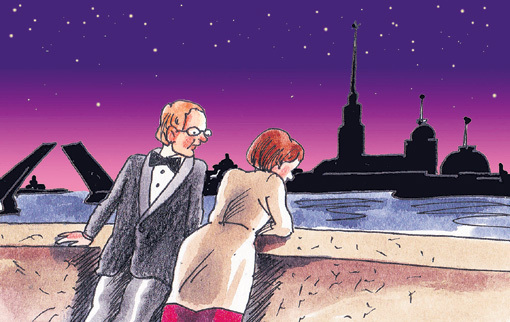 На улице темно, все-таки начало ноября. Довольно холодно. Женя мужественно ежился в тоненьком фраке. Поперек улиц, Невского проспекта, сверкали праздничные гирлянды. Они вносили праздничность в город. Вокруг шумели машины, смеясь проходили люди. Женя с Инной шли по набережной. Нева, корабли на ней переливались разноцветными лампочками. Во время прогулки тут и там из тьмы возникали все основные ленинградские достопримечательности. Крейсер «Аврора», Летний сад, Казанский собор, мост Клодта с лошадями, каналы, дворцы.