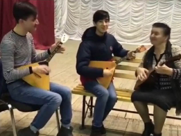 Двое учеников под ободряющие команды преподавательницы, которую, как выяснилось из комментариев, зовут Светлана Сергеевна, держат темп аккордами, а сама женщина солирует на национальном осетинском инструменте, который называется дала-фандыр.