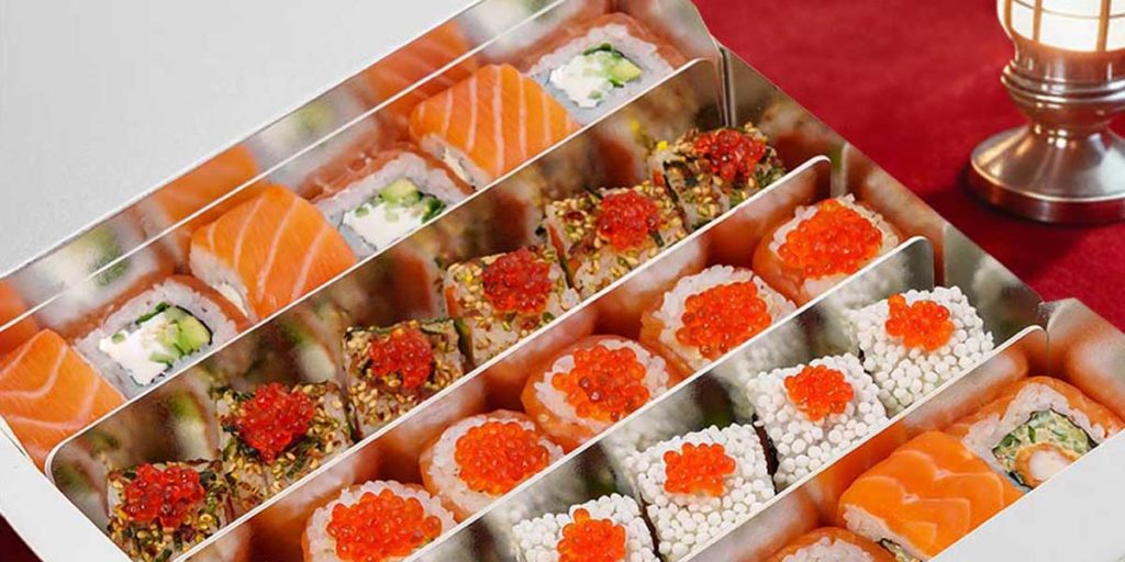 - Ролл Санта: красная икра и тающий во рту лосось — настоящий вкус Нового года. Сливочный сыр с трюфелем и огурец добавляют нежности и свежести.