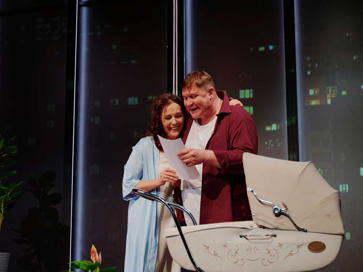 Спектакль наполнен точными бытовыми деталями, в которых каждый узнаёт себя: домашние разговоры, семейные праздники, привычные мелочи — тапки, зонты, забытые носки и бесконечные походы в поликлинику.