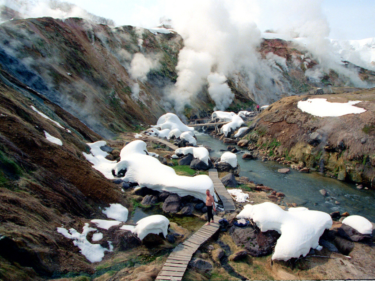 Эпизоды картины «Земля Санникова» снимали в Долине гейзеров. Но те, кому вертолетная экскурсия не по карману, увидят почти то же самое - булькающие и плюющие паром фумаролы, кислотные озера, грязевые котлы.