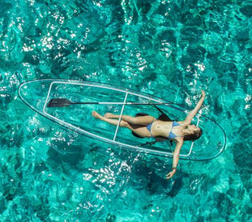 Главным образом, это красиво. Прозрачные байдарки сейчас стали одним из крутейших трендом на американских и еровпейских пляжах. На самом деле - это даже скорее гибрид каноэ и каяка, который позволяет погрузиться в водный мир, совершенно при этом не промокнув. Девайс выдержит испытание даже не очень быстрым течением. В комплект входят рама, сиденья и надувные камеры.